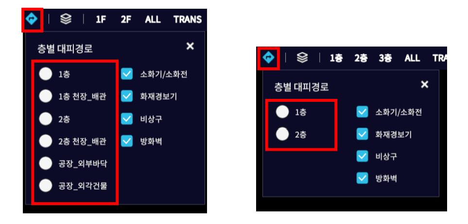 층별 대피경로에서 표시되는 층 토글 목록을 설정하여 필요한 층만 표시하거나, 평면도 상태에서 오브젝트의 표시 여부를 그룹별로 설정할 수 있습니다.