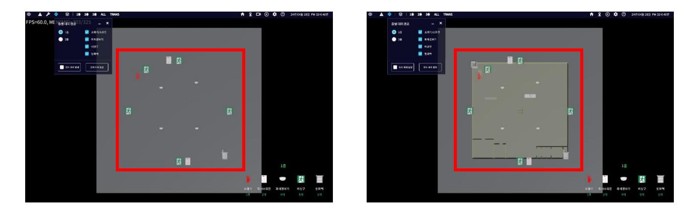 층별 대피경로에서 층 토글을 클릭한 뒤 보여지는 평면도에서 오브젝트의 표시 여부를 그룹별로 설정할 수 있습니다.