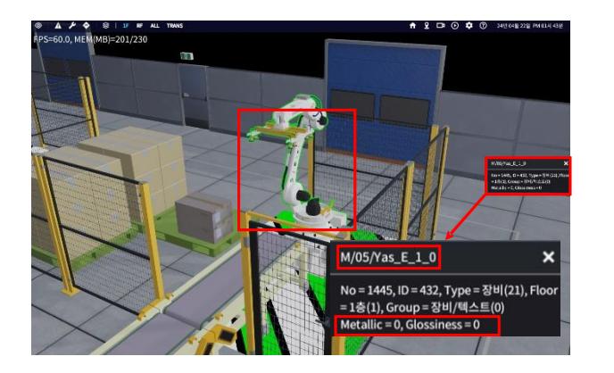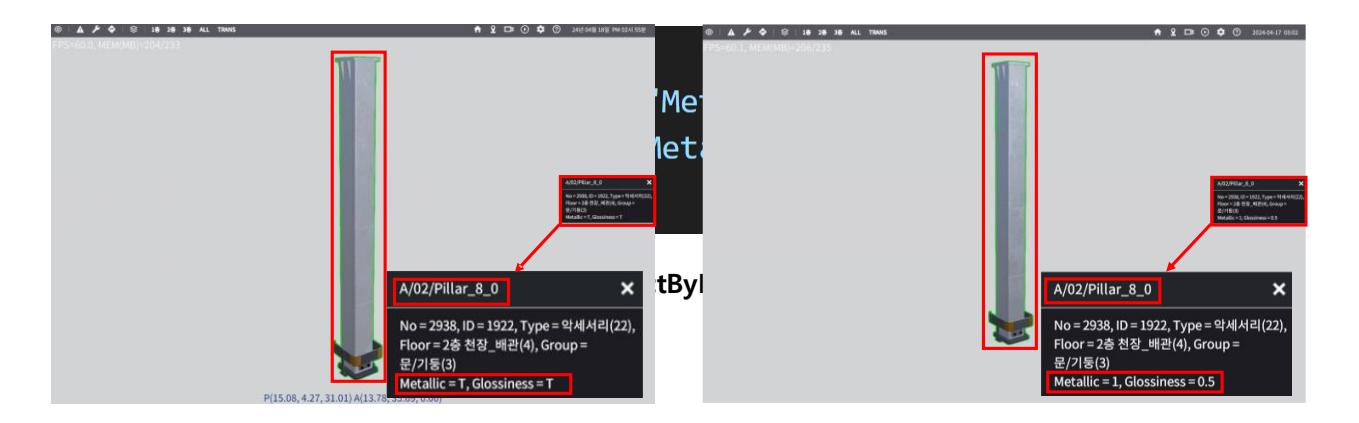 "Metallic" 또는 "Glossiness" 항목을 입력하지 않으면 입력하지 않은 항목에 대해 오브젝트의 Material이 가지고 있는 원래 값이 적용됩니다.