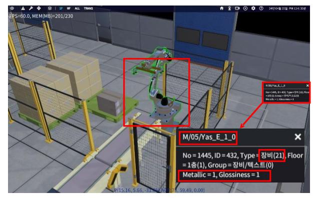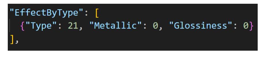 Type으로 오브젝트를 분류하여 Metallic, Glossiness 값을 적용합니다. "Type"에 적용시킬 오브젝트의 이름을 입력하고, "Metallic", "Glossiness"에 각각 적용할 값을 입력합니다.