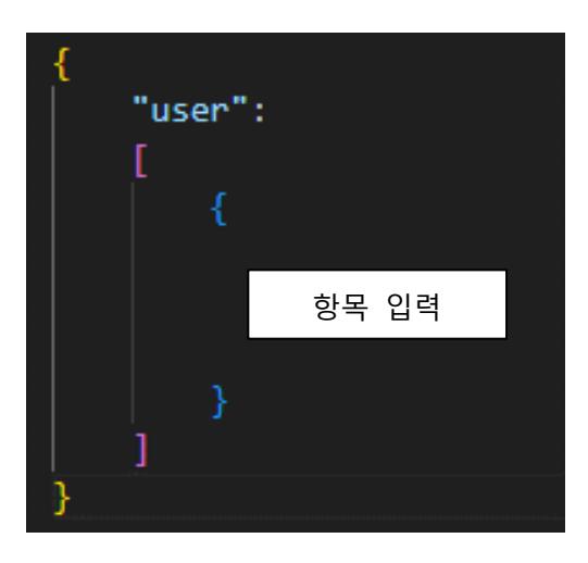 모든 항목은 "user" 이름을 가진 중괄호 안에 입력합니다.