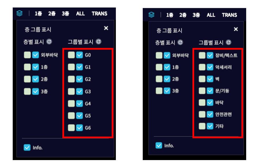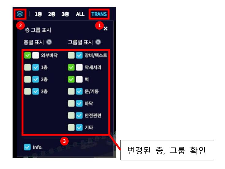 에서 설정한 설정 값을 적용하여 층과 그룹을 표시/반투명화 시킬 수 있습니다.
