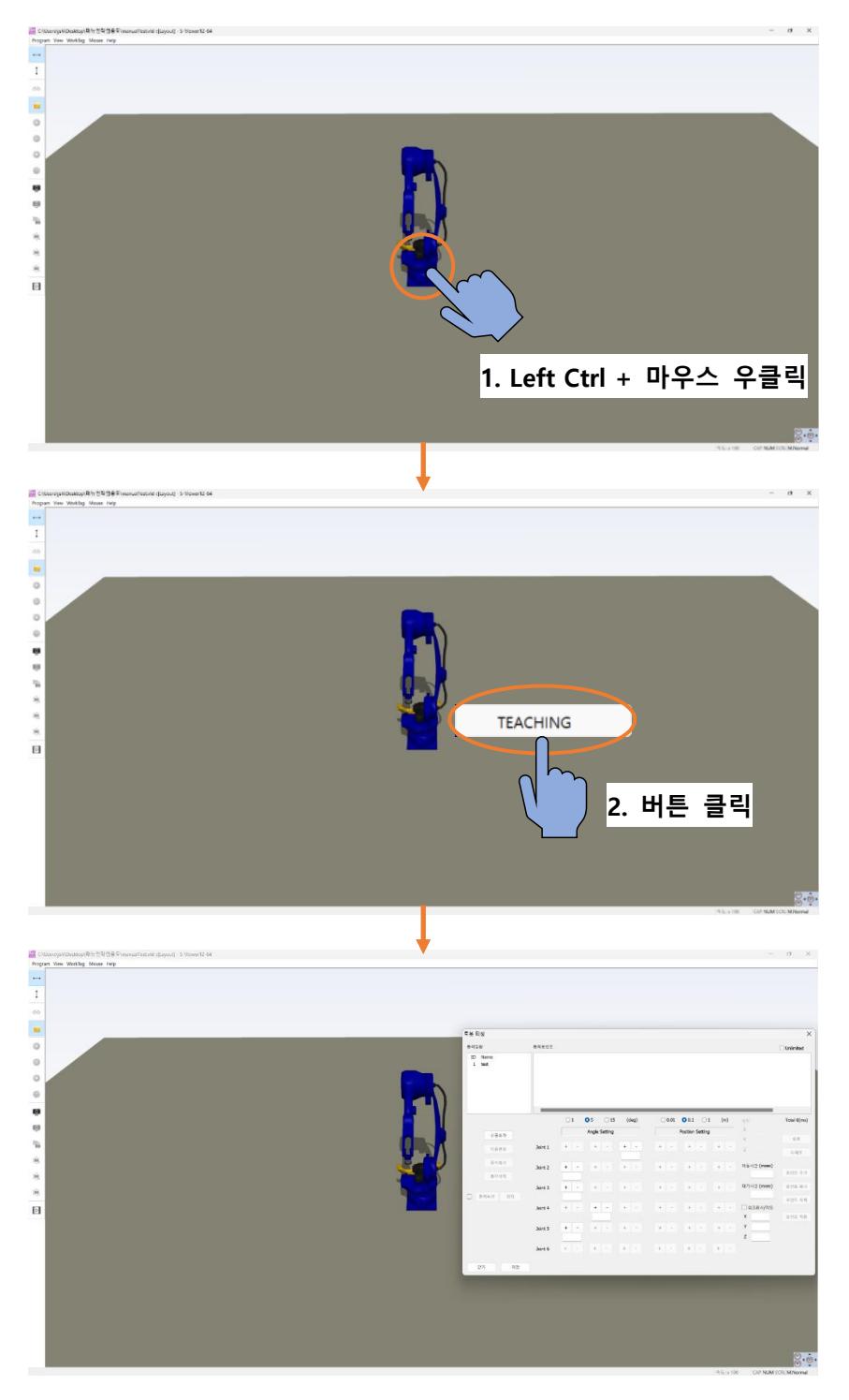 티칭 장비 로봇에 Teaching 항목을 적용하여 동작을 즉시 확인할 수 있습니다.