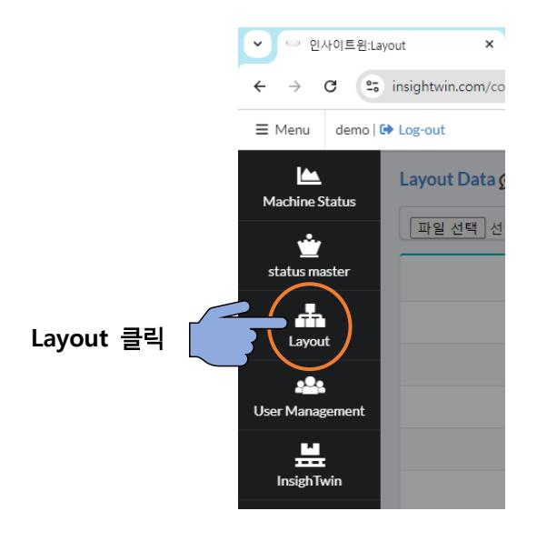 메뉴에서 Layout 항목을 클릭하여 Teaching 파일을 등록합니다. 파일 등록은 파일 선택 버튼을 클릭하거나 **'선택된 파일 없음'**란에 Teaching.json 파일을 드래그 앤 드롭하여 등록합니다.